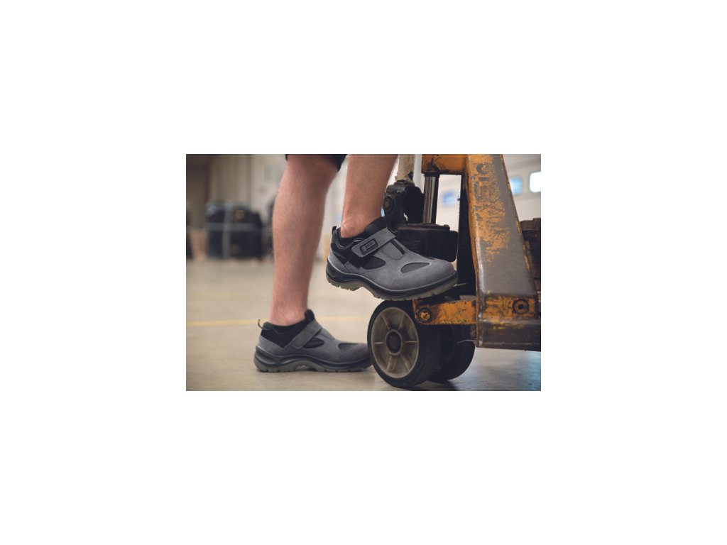 S1 SRC Bezpečnostné sandále s kompozitnou bezpečnostnou špicou. PU/PU podošva rezistentná voči olejom, absorpcia energie v päte, vysoká odolnosť voči pošmyknutiu. Zvršok z brúsenej kože.