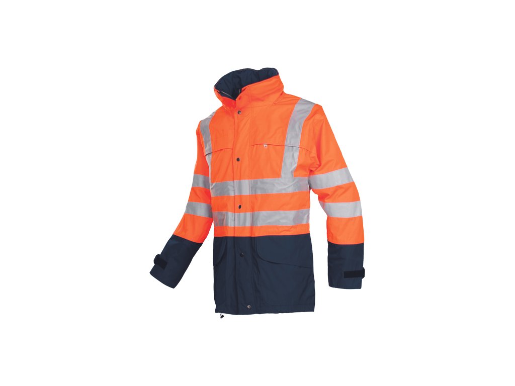 HI-VIS bunda s odopínacou kapucňou v golieri a možnosťou zúženia obvodu pása pomocou šnúrky.