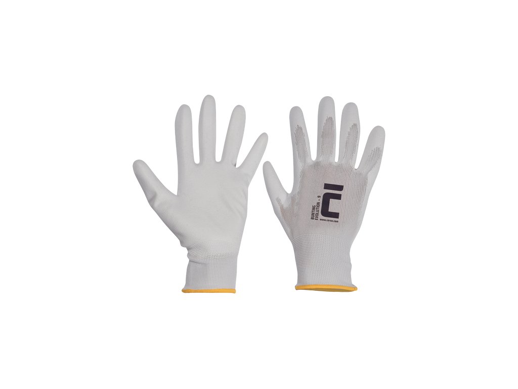 Pletené, bezšvové, polyesterové, rukavice s tenkou vrstvou polyuretánu v dlani a na prstoch a pružnou manžetou.Dodatočné parametre