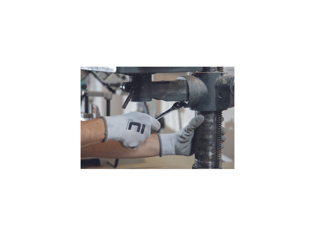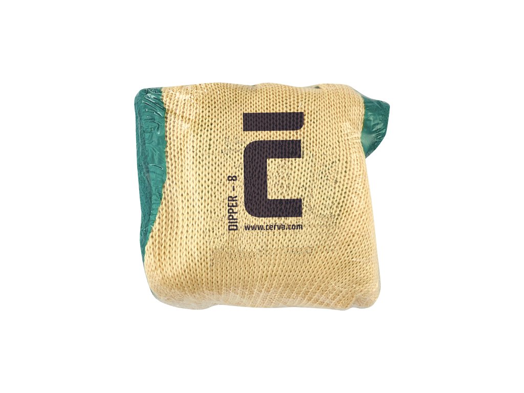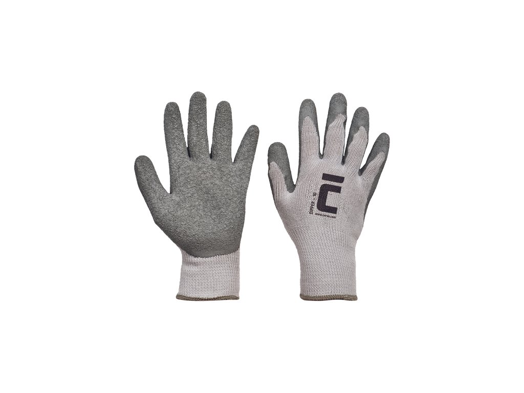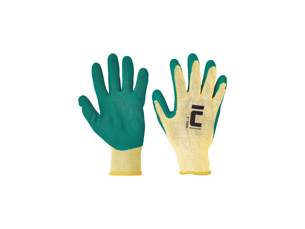 Pletené, bezšvové, rukavice zo zmesi bavlna/polyester, polomáčané v prírodnom latexe, s protišmykovou úpravou v dlani a na prstoch a pružným nápletom na zápästí. Veľkosti: dámske 7, 8 (zelená), pánske 9, 10, 11 (sivá)Dodatočné parametre