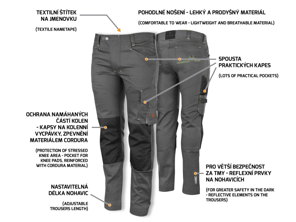 - namáhané časti kolien s vreckom na kolenné vypchávky sú spevnené materiálom Oxford 600D,