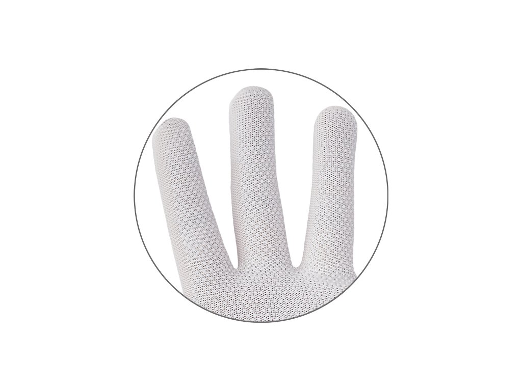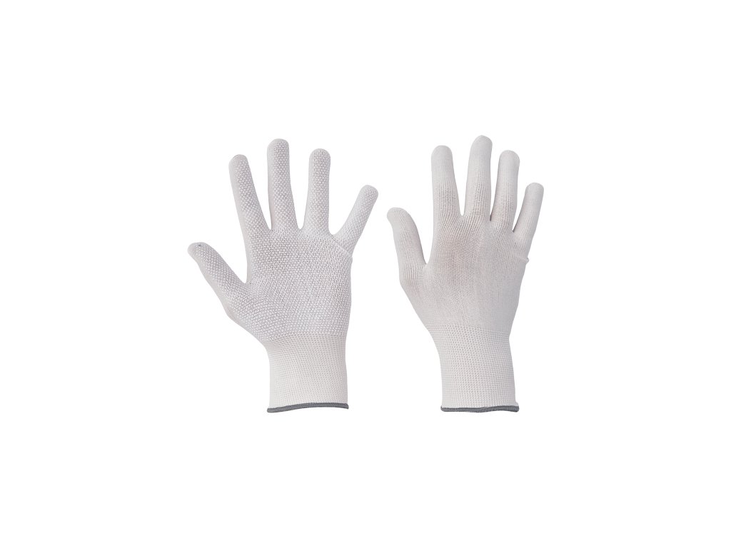 Bezšvové rukavice z polyesteru s PVC terčíkmi v dlani. Pružná manžeta.Dodatočné parametre