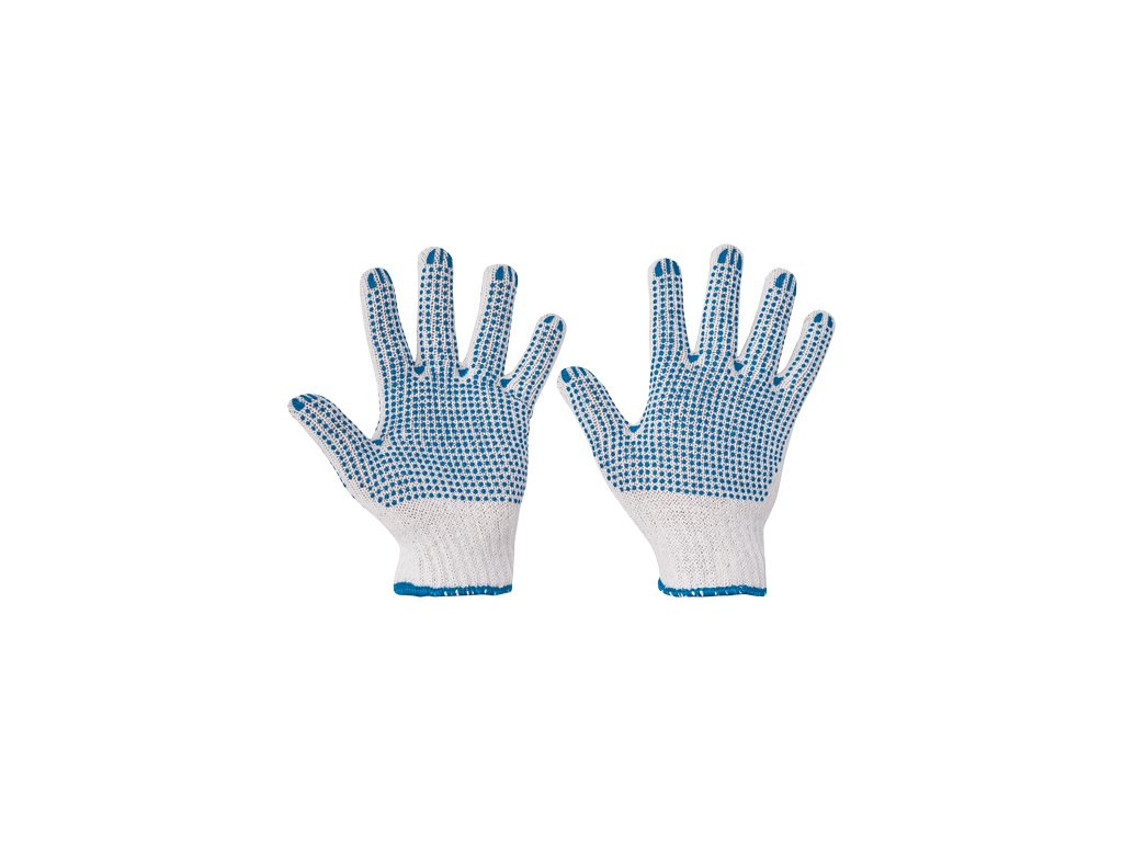 Pletené bezšvové rukavice zo zmesi polyester/bavlna, s PVC terčíkmi v dlani, na chrbte a prstoch.Dodatočné parametre