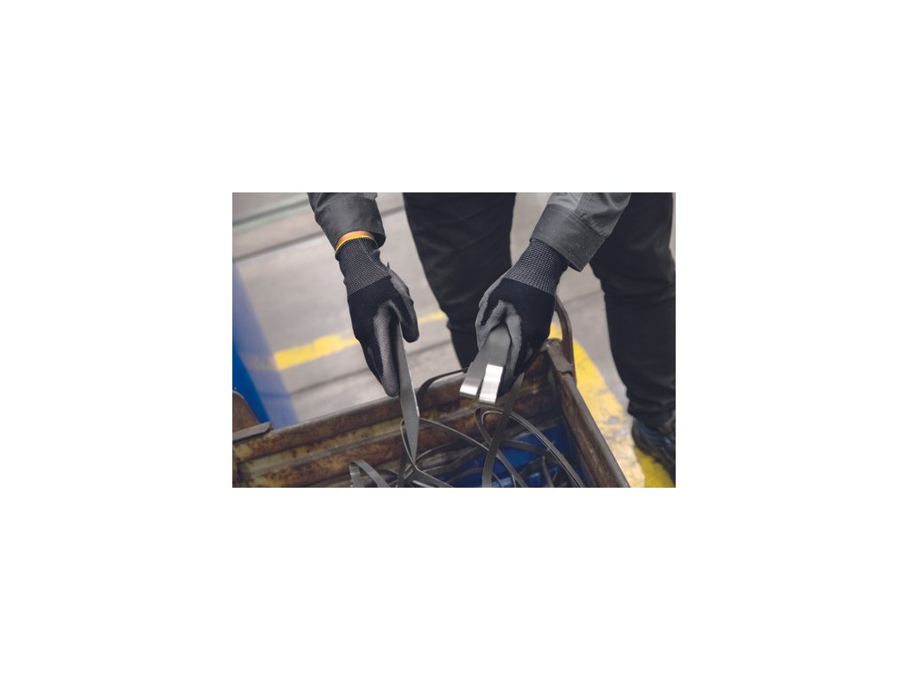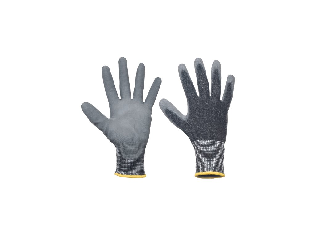 Pletené bezšvové rukavice kategórie prerezu C, sivý PU na dlani a prstoch, pružná manžeta.Dodatočné parametre