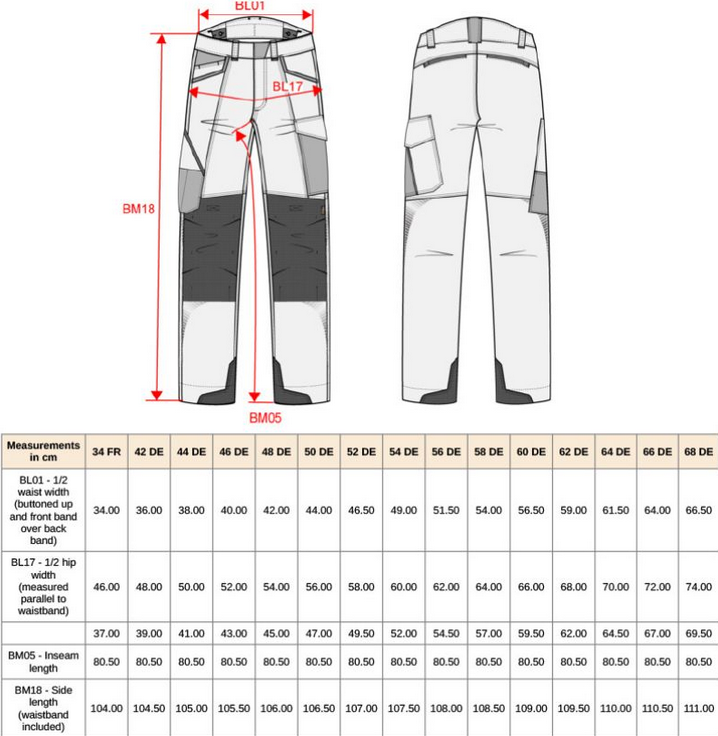 - certifikované podľa EN 14404-1 + NF EN 14404-3: typ 2 / level 1 iba v kombinácii s chráničmi kolien (štýl WKP 150, artikel 20.W105), chrániče kolien (WKP 150) sú k dostaniu samostatne, reflexné detaily