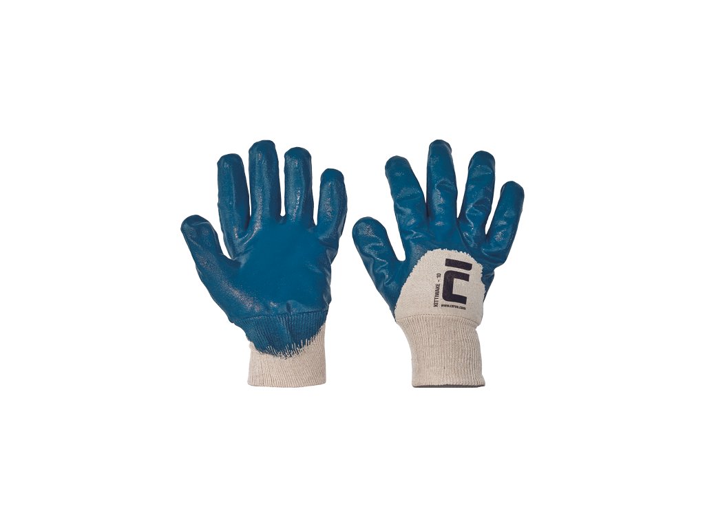 Modré rukavice šité z bavlneného úpletu, polomáčané v nitrile, s pružnou manžetou.Dodatočné parametre