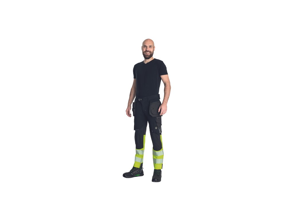 Pánske pracovné nohavice HI-VIS s elastickým pásom s 2 bočnými odnímateľnými multifunkčnými "lietajúcimi" vreckami