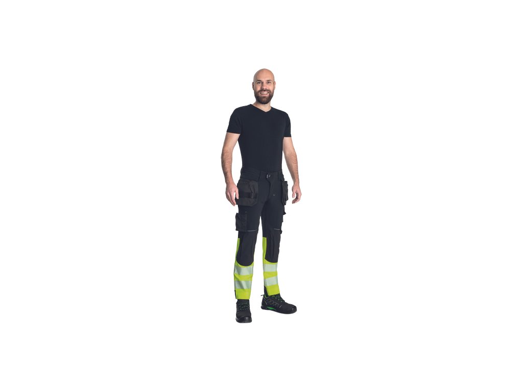• pánske pracovné nohavice HI-VIS s elastickým pásom s 2 bočnými odnímateľnými multifunkčnými "lietajúcimi" vreckami