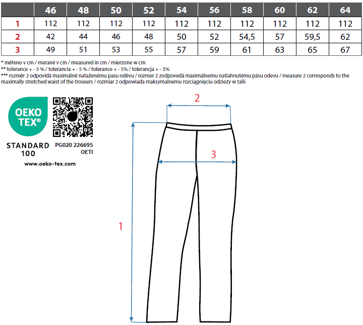 Vybavenie nohavíc: flexibilný pás s možnosťou úpravy veľkosti a pútkami na opasok, protišmyková potlač na vnútornej strane pásu