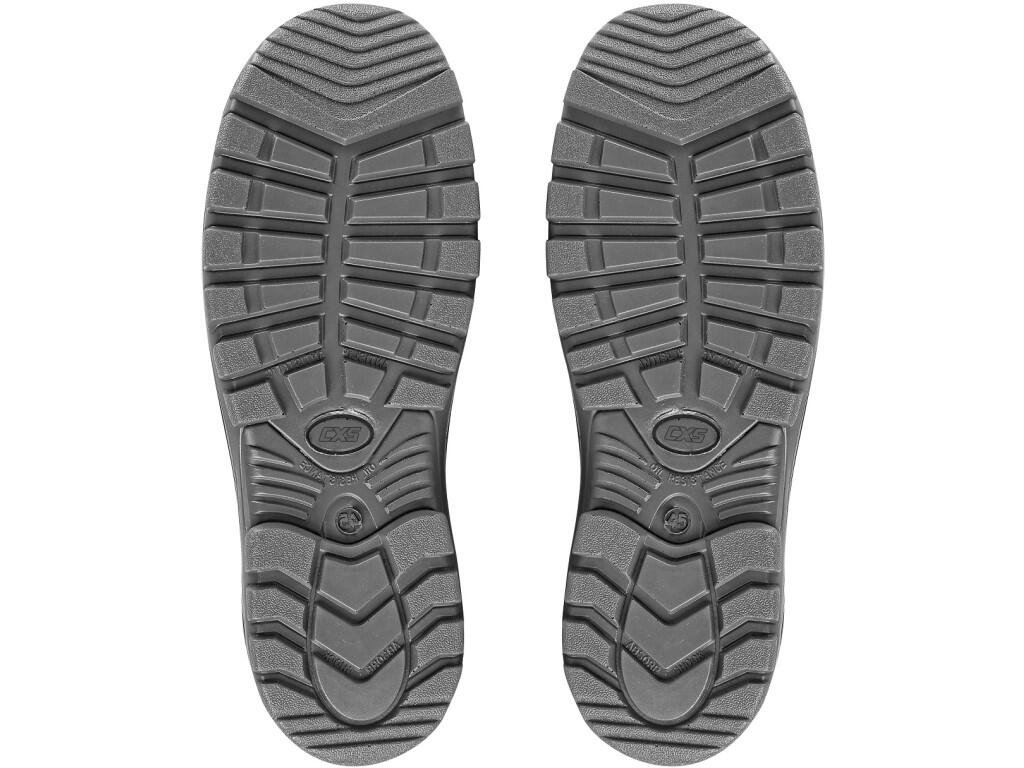 Členková pracovná obuv, kožená, s reflexnými doplnkami. Materiál: zvršok z 1,4 - 1,6 mm brúsenej kože kombinovanej s 1,6 - 1,8 mm hladkou štiepenkou s PU filmom, polstrovaný textilný golier, priedušná a oderu odolná mesh podšívka, vyberateľná, pohodlná a anatomická vložka z polyesteru, podošva: PU-PU, protišmyková, antistatická, olejovzdorná.Dodatočné parametre