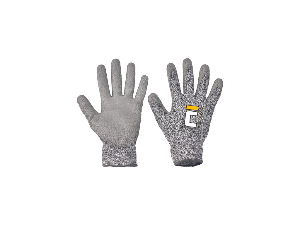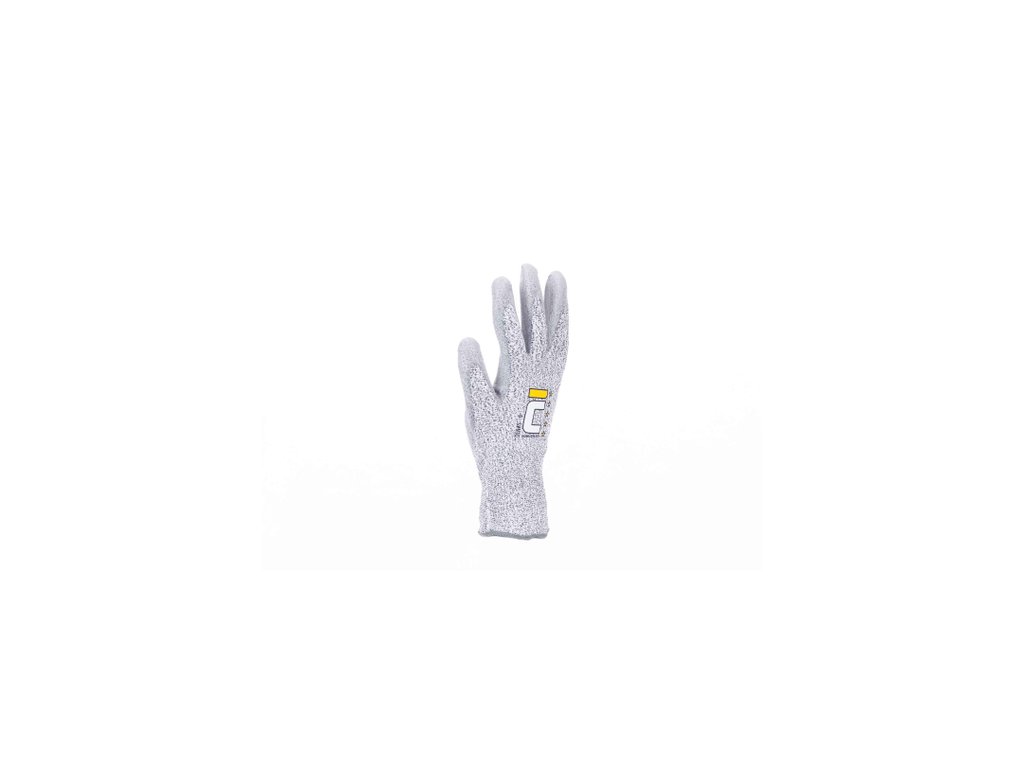 Pletené bezšvové rukavice s obsahom vlákna DYNEEMA a nylonu s vysokou odolnosťou proti prerezu ostrím, s vrstvou sivého PU v dlani a na prstoch.Dodatočné parametre