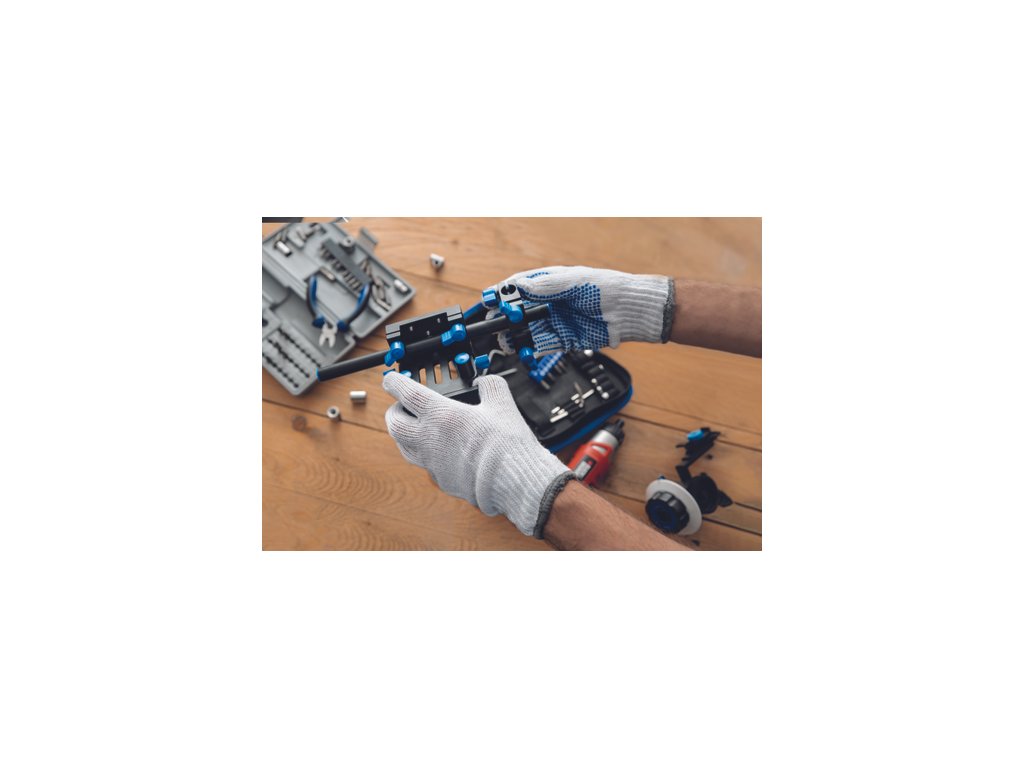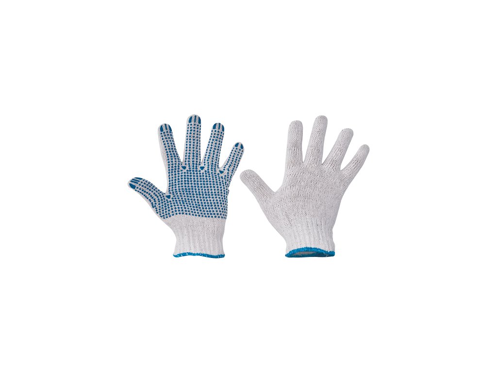 Pletené, bezšvové rukavice, zo zmesi polyester/bavlna s PVC terčíkmi v dlani a na prstoch.Dodatočné parametre
