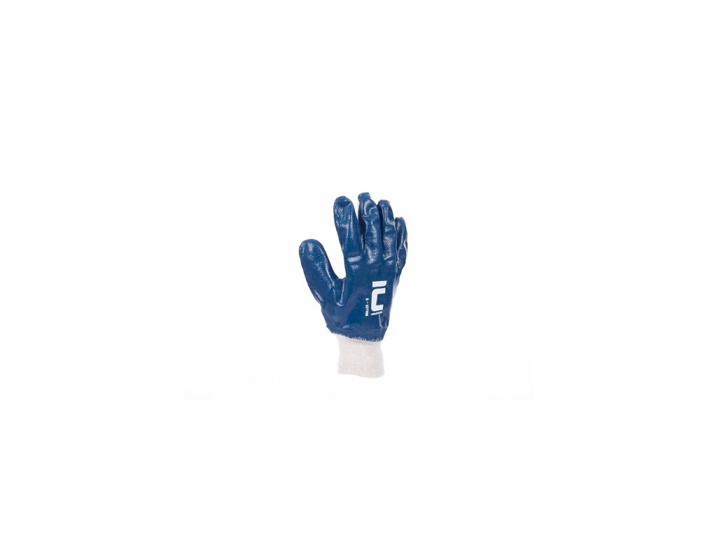 Modré rukavice šité z bavlneného úpletu, celomáčané v nitrile, s pružnou manžetou.Dodatočné parametre