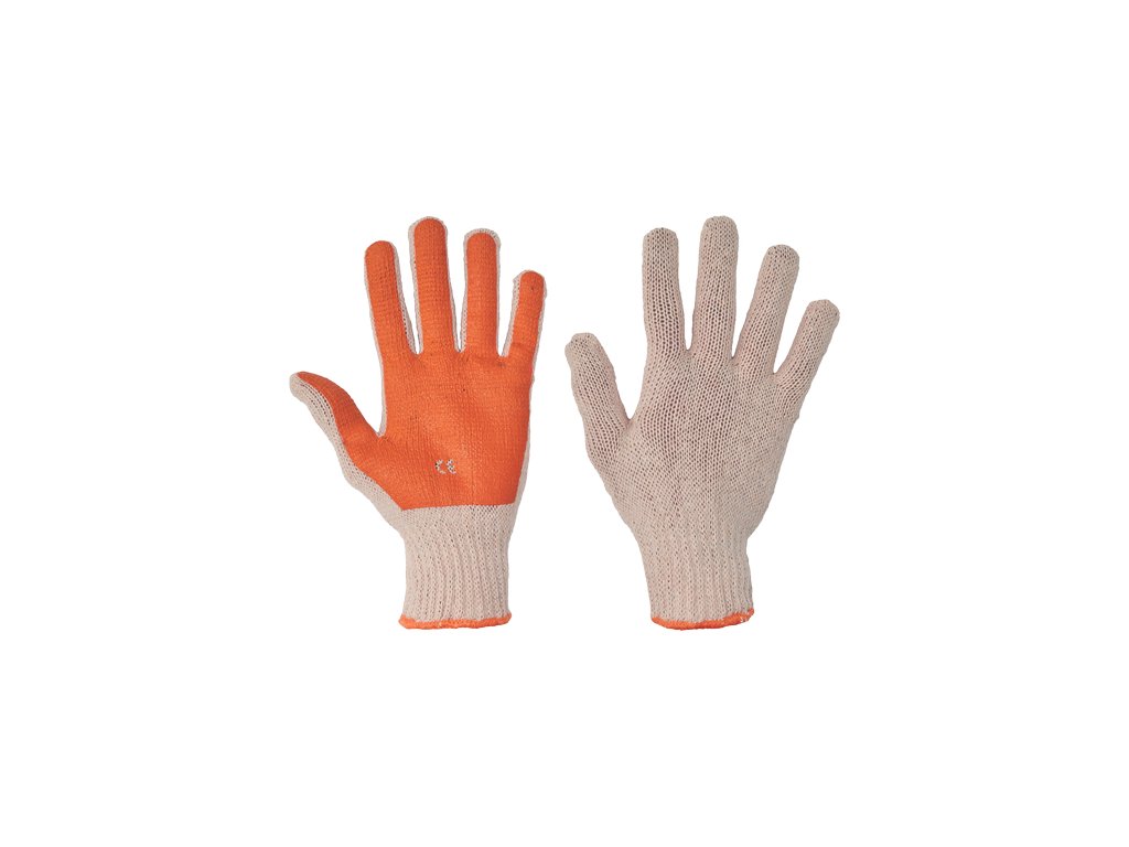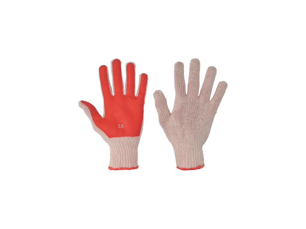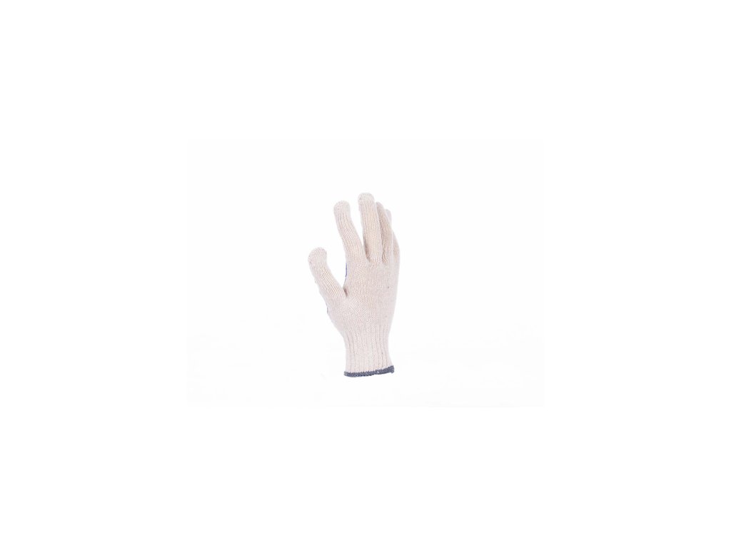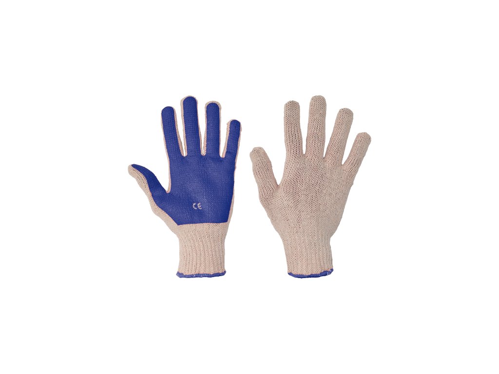 Pletené, bezšvové, bavlnené, rôznofarebné rukavice, polomáčané vo farebnom PVC v dlani a na prstoch, s pružnou manžetou.Dodatočné parametre