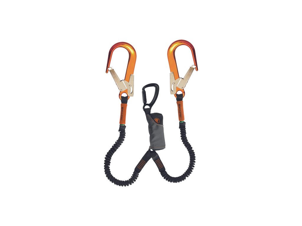 CHARAKTERISTIKA: tlmič so spojovacím prostriedkom dvoch elas popruhov pádovým indikátorom konca popruhov sú osadené hliníkovými hákmi FS 90 AL (otvorenie 60 mm, 22 kN), na tlmiči hliníkovou karabínou STAK TRI Do tlmiča je integrovaná záchranná trauma slučka