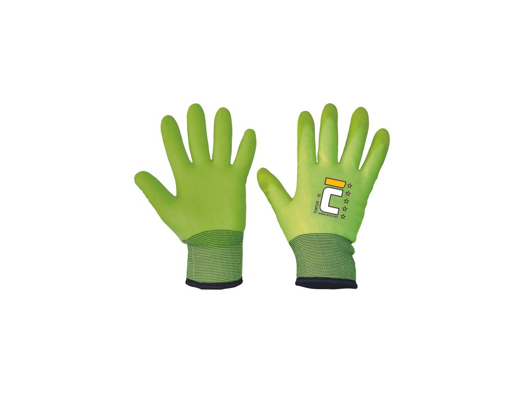 Zateplené, vodu odpudzujúce pletené signálne nylonové rukavice s vrstvou PVC v dlani a na prstoch, s komfortným froté zateplením a pružnou manžetou.Dodatočné parametre