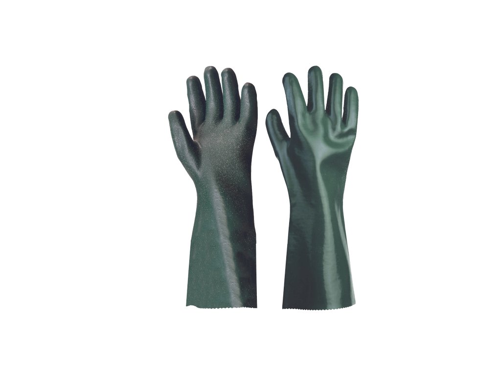 Rukavice šité z bavlneného úpletu, máčané v PVC s obsahom nitrilu, s posypom granulovaného PVC v dlani, odolné mechanickým a chemickým rizikám, v celkovej dĺžke 45 cmDodatočné parametre