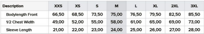 Tabuľka veľkostí: